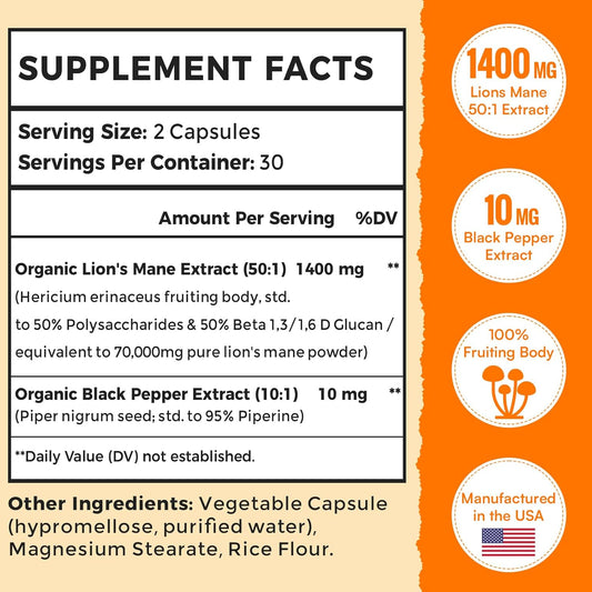 Organic Lions Mane Capsules - 10,000mg Extract, 30% Polysaccharides - Energy, Memory, Focus - 60 Vegan Capsules