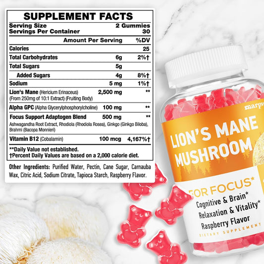 Organic Lions Mane & Ashwagandha Gummies for Memory, Focus & Immune Support - 60 Mushroom Gummies