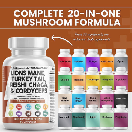 Nutraceuticals Lions Mane 20in1 Mushroom Supplement with Turkey Tail Reishi Cordyceps Chaga Maitake Meshima Poria Cocos Shiitake Oyster Porcini Enoki - Twin Pack