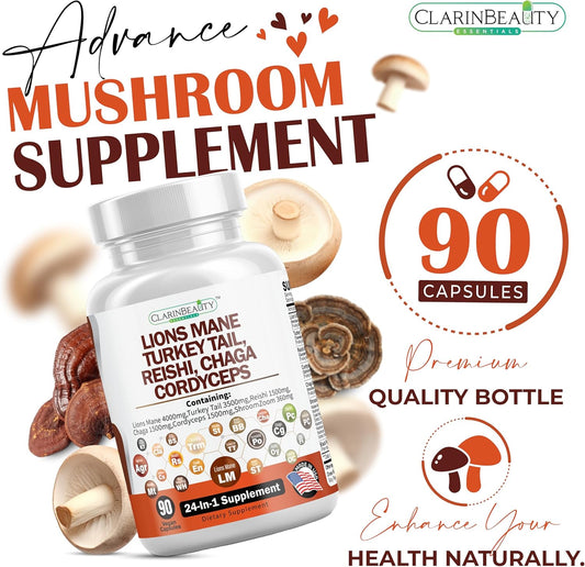 Immune System Booster & Brain Supplement - 14 Mushroom Capsules with Lionโs Mane, Reishi, Maitake, Turkey Tail, Chaga, Black Pepper - 30% Beta-Glucan for Absorption
