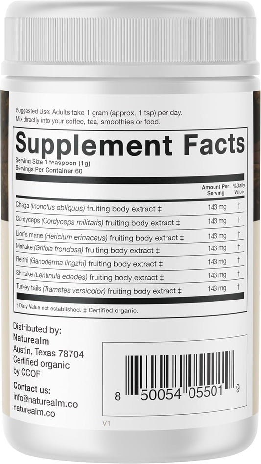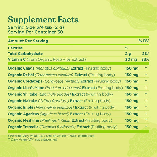 Organic Mushroom Blend Powder Complex with Lion’s Mane, Cordyceps, Chaga, Reishi | Immune Support | Vegan, Gluten-Free | 30 Servings