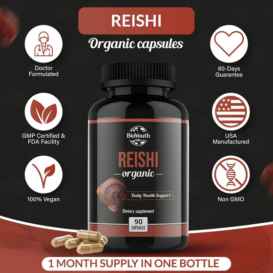 Organic Reishi Mushroom Capsules - Non-GMO & Allergen-Free | 90 Capsules (1-Month Supply) by BioYouth