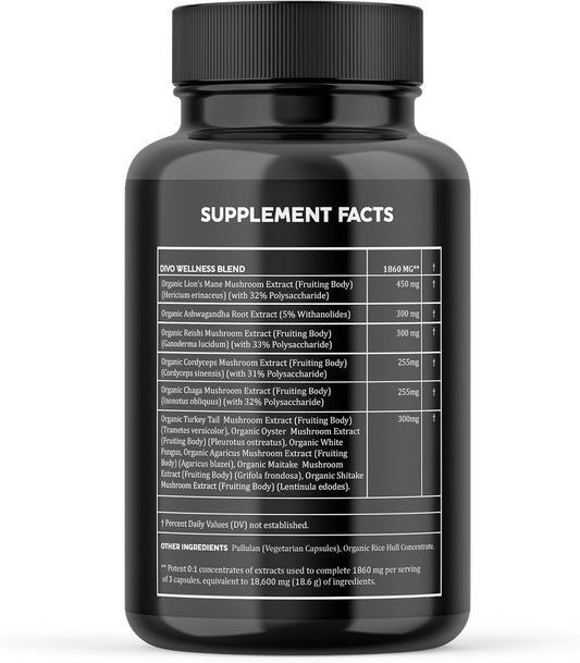 Organic Mushroom Complex Supplement with Ashwagandha - Lion’s Mane, Reishi, Cordyceps, Chaga, Turkey Tail & More for Focus, Energy, and Brain Boost - 90 Capsules