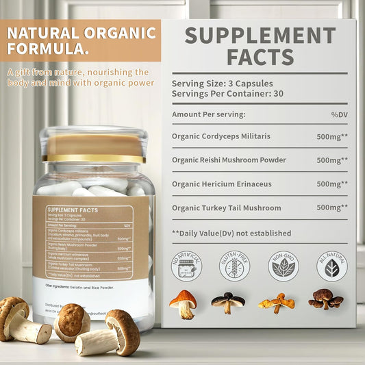 Organic Mushroom Supplement for Immune Boost, Memory, Focus & Energy - Lion's Mane, Reishi, Cordyceps, Turkey Tail - Brain Support - 2000mg, 90 Vegan Capsules with Capsule Box