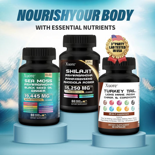 All-in-One Mushroom & Herb Supplement with Shilajit, Sea Moss, Black Seed Oil, Lions Mane, Turkey Tail, Reishi, Cordyceps, Chaga, Ashwagandha, Ginger, Rhodiola Rosea & Panax Ginseng