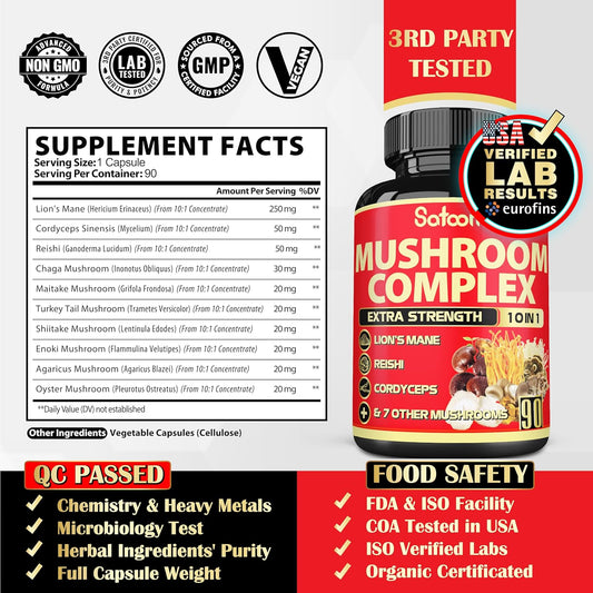 Premium 10in1 Mushroom Supplement Complex - Lions Mane, Cordyceps, Reishi, Chaga - Memory and Focus Brain Supplements - 90 Day Supply