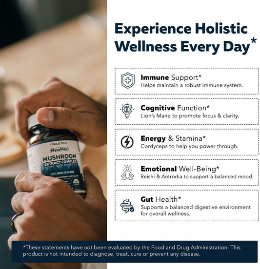 High-Potency Triquetra Health MycoMax Mushroom Complex with 70% Beta Glucans - US Grown, Ultrasonic Extraction - Lions Mane, Cordyceps, Reishi & More - Supports Cognition, Immunity, Energy - 60 Capsules