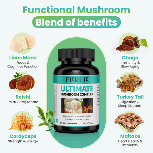 High Strength 6-in-1 Mushroom Complex Supplement with Lions Mane, Reishi, Cordyceps, Chaga, Turkey Tail, Maitake - Supports Focus, Memory, Brain Health, and Immune System - 120 Capsules