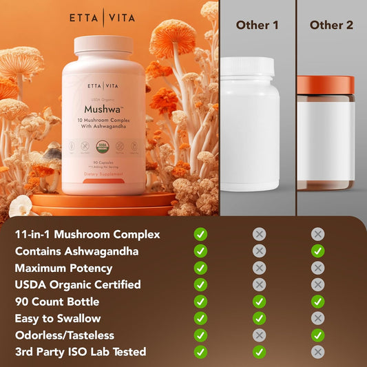 Organic Lions Mane Supplement Capsules with Adaptogenic Mushroom Complex - Energy, Focus, Immunity - 18,600mg/serv - USDA Certified - Etta Vita