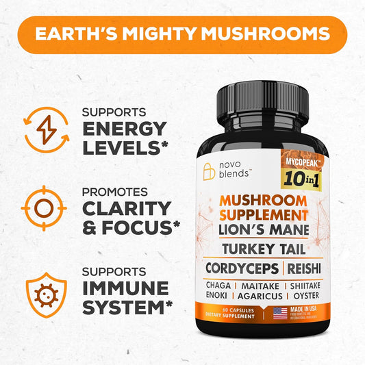 Premium Mushroom Supplement 10x Complex - Lions Mane, Turkey Tail, Cordyceps, Reishi, Chaga, Maitake, Shiitake, Oyster Extract - Brain Support Nootropic for Memory and Focus
