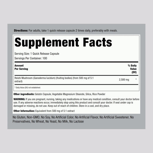 High Potency Reishi Mushroom Supplement | 2500mg | 100 Capsules | Herbal Extract with Ganoderma Lucidum | Non GMO, Gluten Free