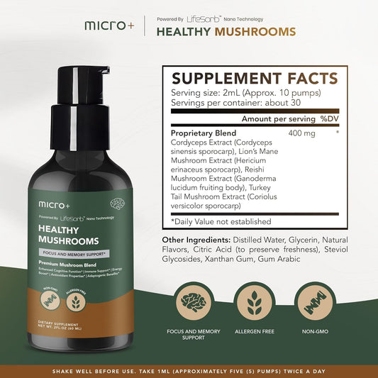 Micro+ Nootropic Brain Supplement with LifeSorb - Health Mushroom+ for Focus, Memory, Cognitive Boost