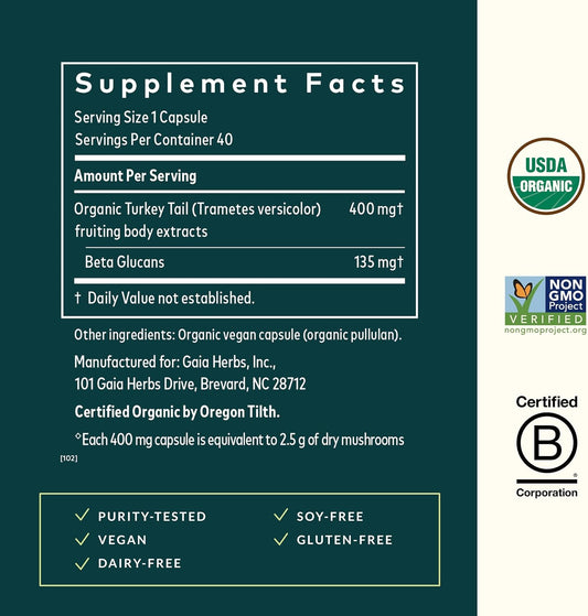 Organic Turkey Tail Mushroom Immune Support Supplement for Liver Health - 40 Vegan Capsules
