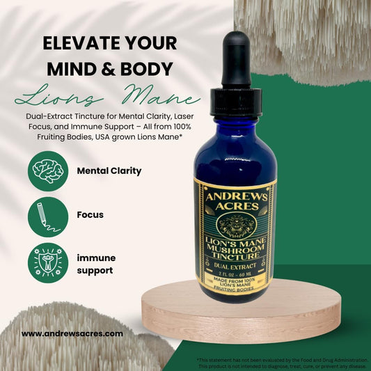Premium Dual Extract Lion's Mane Tincture - 100% Fruiting Bodies (2 oz) - Andrews Acres