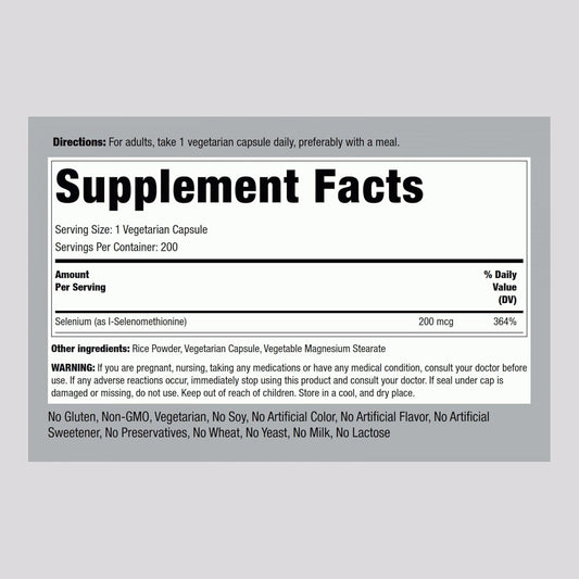 200 Capsules Piping Rock Selenium Supplement | Yeast Free, 200mcg | Vegetarian, Non-GMO, Gluten Free
