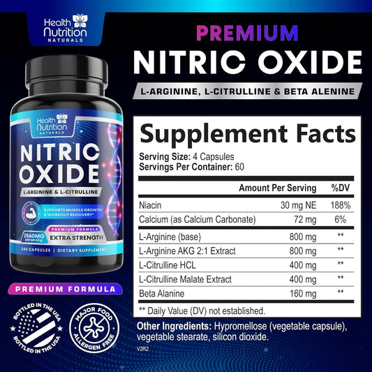 Premium Muscle Support Nitric Oxide Supplement - Extra Strength L-Arginine Blend with Citrulline Malate, AAKG, and Beta Alanine - Boost Energy & Strength for Intense Workouts - 240 CapsulesVendor:Health Nutrition NaturalsRegular price $120.41 AUDRegular priceUnit price / per-