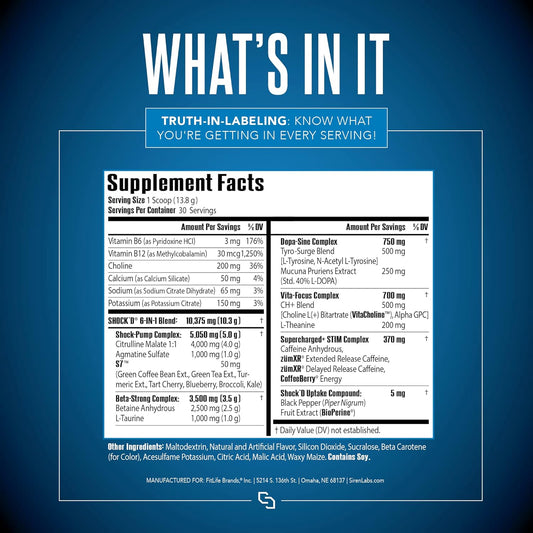 Siren Labs Shock’D Yoked High Stim Pre-Workout - High Energy & Muscle Pumps - Nitric Oxide Booster - Flex on The Beach - 30 ServingsVendor:SIRENLABSRegular price $199.80 AUDRegular priceUnit price / per-
