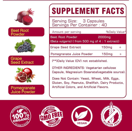 Organic Beet Root Capsules 2000mg for Circulation & Energy, Nitric Oxide Supplement with Grape Seed Extract & Pomegranate Juice Powder, Non GMO - 240 CountVendor:SafgumjelRegular price $110.41 AUDRegular priceUnit price / per-