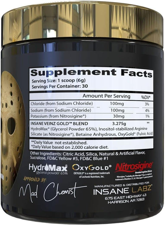 Insane Labz Insane Veinz Gold Non-Stimulant Pre Workout Powder with Hydromax and Nitrosigine for Increased Vascularity and Blood Flow - 30 Servings, Apple FlavorVendor:Insane LabzRegular price $146.63 AUDRegular priceUnit price / per-