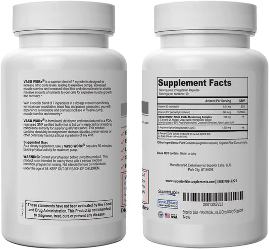 VASOWORx® Nitric Oxide Supplement - Extra Strength 1,600mg - 180 Capsules - Energy & Circulatory Support