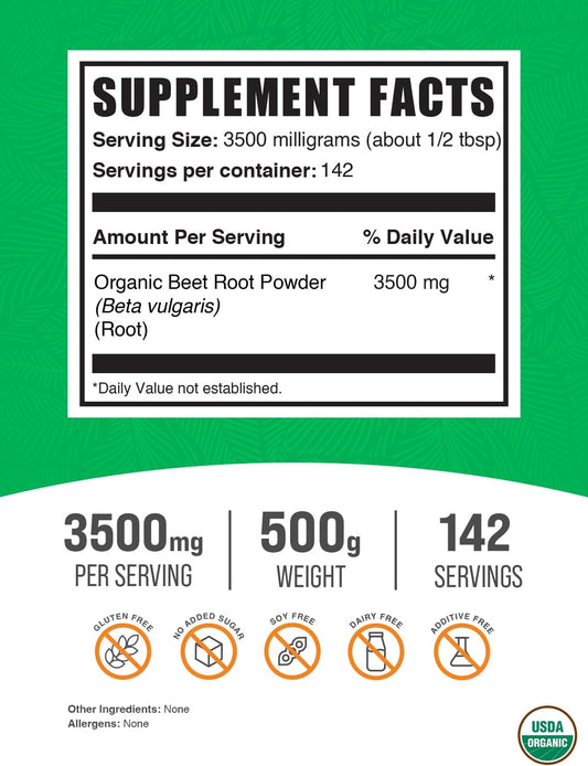 Organic Beet Root Powder - Superfood Supplement, 3500mg per Serving, Vegan & Gluten Free - 500g (1.1 lbs) Pack of 1