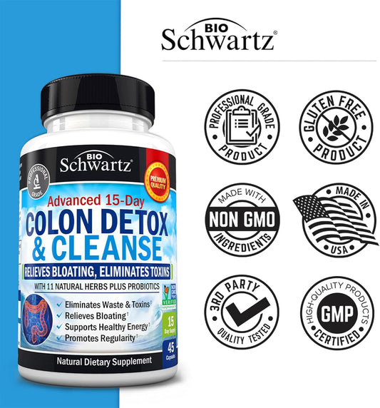 BioSchwartz Colon Cleanser & Detox - Fast-Acting 15-Day Cleanse for Digestive Support with Probiotic Fiber, Psyllium Husk, Noni - Constipation Relief & Bloating Support - Non-GMO - 45 Count