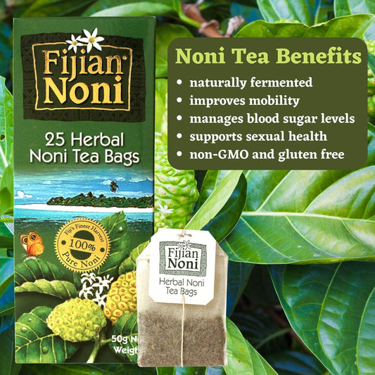 Organic Fijian Noni Herbal Tea with Pure Ceylon Green Tea - 25 Tea Bags (50g) - Made with Noni Fruit Leaves from Fiji