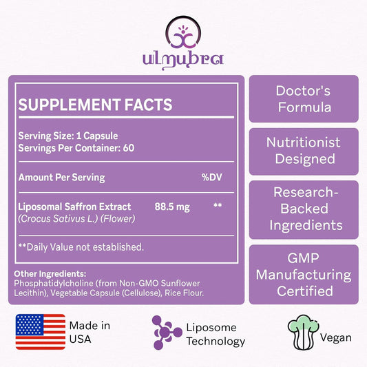 120 Vegan Capsules of Ulmubra Liposomal Saffron Supplements, 100% Pure Extract for Mood, Energy, Vision & Focus, 88.5 mg, High Absorption