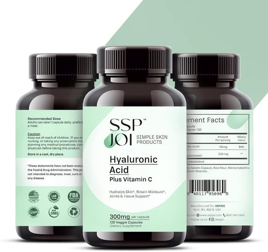 120 Veggie Capsules of sspjoi Hyaluronic Acid 250mg and 50mg Vitamin C - Promotes Skin Hydration and Joint Lubrication for Youthful Skin
