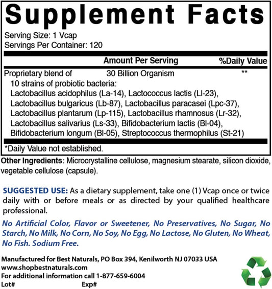 120 Count Best Naturals Probiotic with 10 Strains and 30 Billion CFU, Shelf Stable, 120 Veggie Caps x 2 Pack