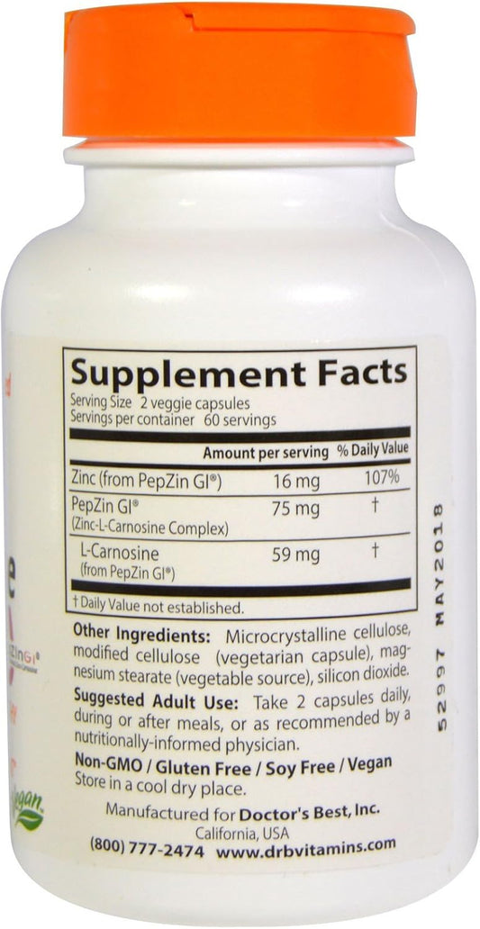 120 Count Doctor's Best Zinc Carnosine Complex Capsules with PepZin GI - Vegetarian Formula for Gut Health