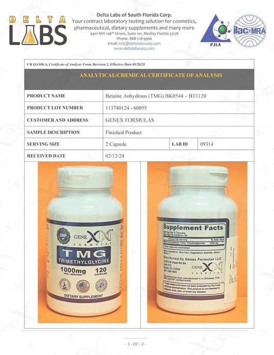 120 Capsules Genex Formulas 1000mg TMG Liver Supplement - Betaine Anhydrous Trimethylglycine for Healthy Homocysteine - Gluten Free & Non-GMO - 30-Day Supply