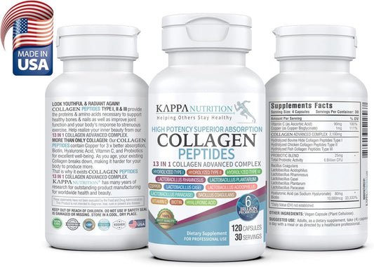 120 Capsules KAPPA NUTRITION with Collagen, Probiotics, Hyaluronic Acid, Vitamin C, Biotin & MCT Oil for Hair, Nails, and Skin Support