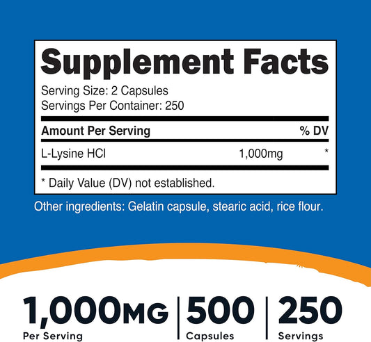 1000mg L-Lysine Capsules - 500 Count (2 Bottles) by Nutricost
