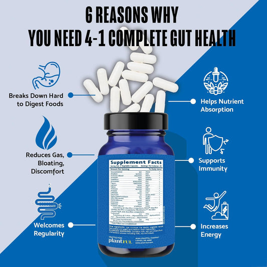 4-in-1 Plantful Research Pre Post Probiotics & Digestive Enzymes - Gut Health Support for Women & Men - Gas & Bloating Relief - 60 Non GMO Capsules