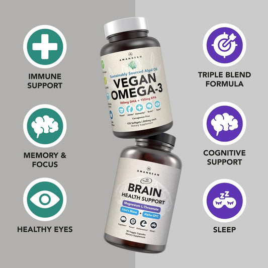 Plant-Based Brain & Omega-3 Bundle: Lion's Mane, Magnesium Threonate, Alpha-GPC, Algae DHA/EPA. Essential Fats for Brain, Eye, Heart & Skin Health. Vegan Fish Oil Alternative.