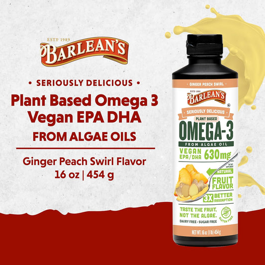 Barlean's Ginger Peach Vegan Omega 3 Liquid Algae Oil Supplement, 630 mg EPA & DHA, Plant Based Omegas, Non-GMO, Gluten Free - 16 oz