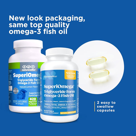 High EPA & DHA Omega-3 Fish Oil Softgels for Dry Eyes, Joints, Heart, and Brain - Lemon Flavor - 60 count