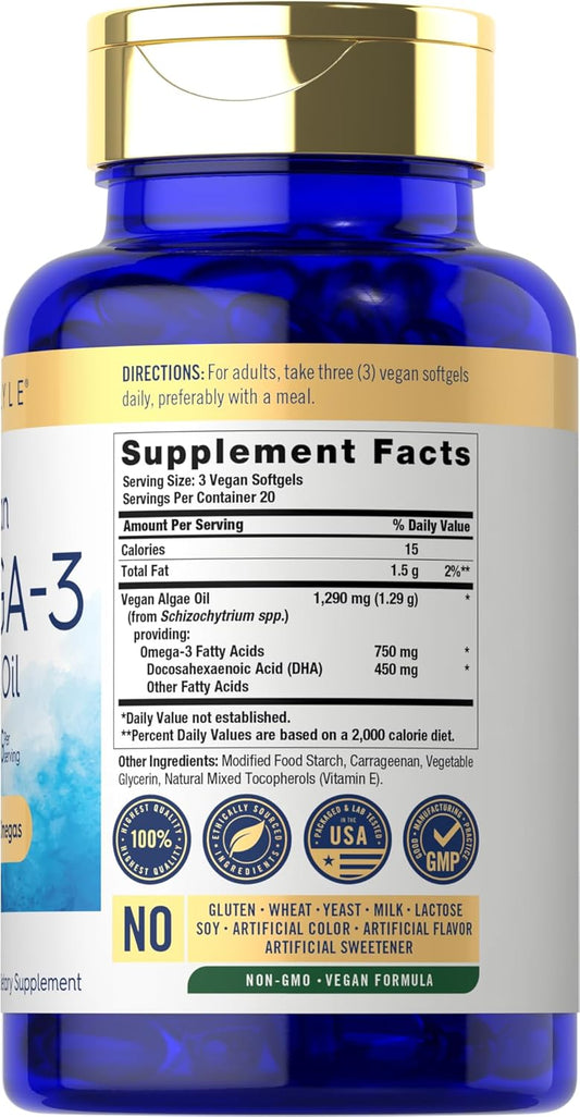 Vegan Omega 3 Supplement from Algae Oil | 1290 mg | 60 Softgels | Plant Based | Non-GMO & Gluten Free by Carlyle
