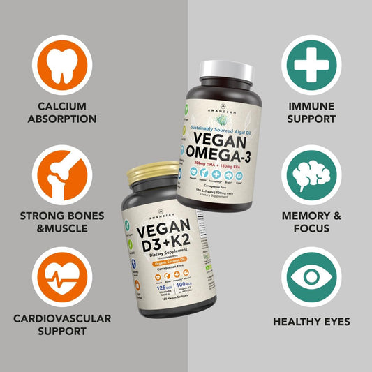 AMANDEAN Plant-Based Omega-3 and Vitamin D3 + K2 Combo with All-Trans MK-7 - Carrageenan Free Veggie Softgels