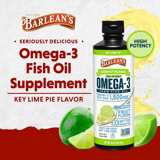 Barlean's Key Lime Pie Omega-3 Fish Oil Liquid Supplement, 1500mg EPA & DHA, Smoothie Flavored, Burpless, 16 oz - Brain, Joint, Heart Health