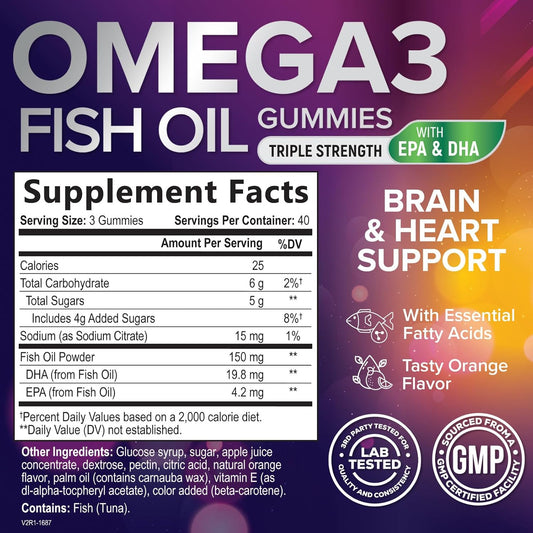 Triple Strength Omega-3 Fish Oil Gummies with High Absorption EPA and DHA - Joint, Heart, Brain Support - 120 Gummies