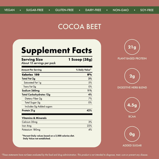 Organic Brown Rice & Pea Protein Isolate, Easy Digestion, 24G Protein, Gluten & Lactose Free Cocoa Beet Powder - 500g Pack