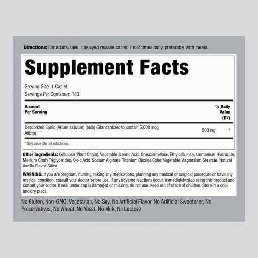180 Caplets Piping Rock Odorless Garlic Pills | High Allicin Concentration | Vegetarian, Non-GMO, Gluten-Free | No Odor