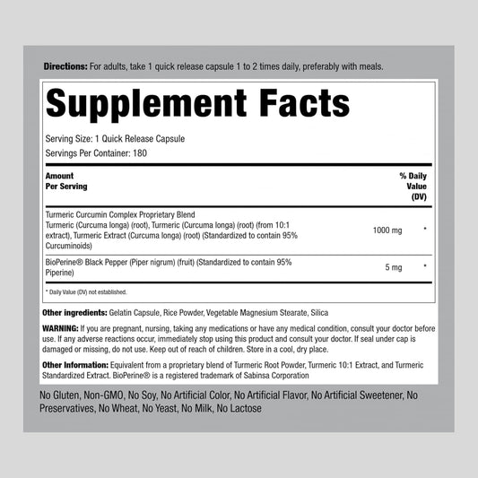 180 Capsules Piping Rock Turmeric Curcumin with Black Pepper 1000mg Complex - Non-GMO, Gluten Free Herbal Supplement