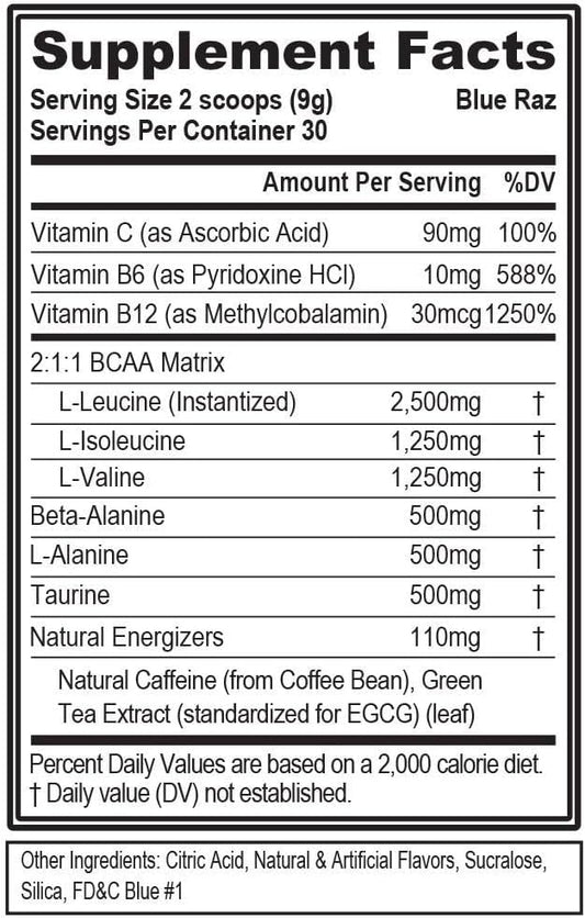 Evlution EVL BCAAs Amino Acids Powder - Energizing BCAA Pre Workout & Post Workout Drink - Muscle Recovery, Growth & Endurance Support - Blue Raz Flavor with Natural Caffeine