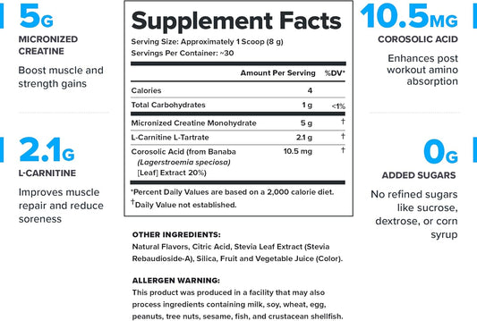 Natural Post-Workout Muscle Builder Drink with Creatine Monohydrate - Fruit Punch Flavor, Safe & Healthy Recovery Supplement (30 Servings)