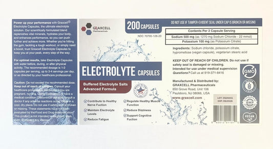 200 Count Bottle of Graxcell Electrolyte Capsules | 500mg Sodium, 100mg Potassium | Non-GMO Vegan Supplement for Hydration & Balance, Made in USA