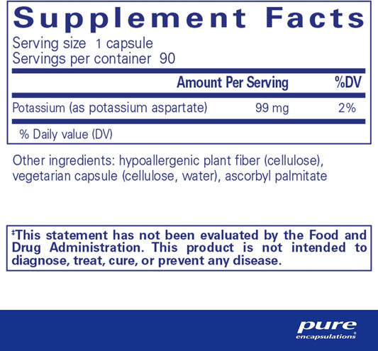 Hypoallergenic Potassium Aspartate Supplement for Nerve, Muscle, Blood Flow, and Heart Health - 90 Capsules