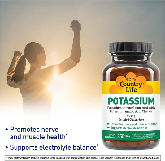 Chelated Potassium 99mg Tablets for Neuromuscular Support & Electrolyte Balance - Gluten Free, Vegan, Kosher - 250 Tablets